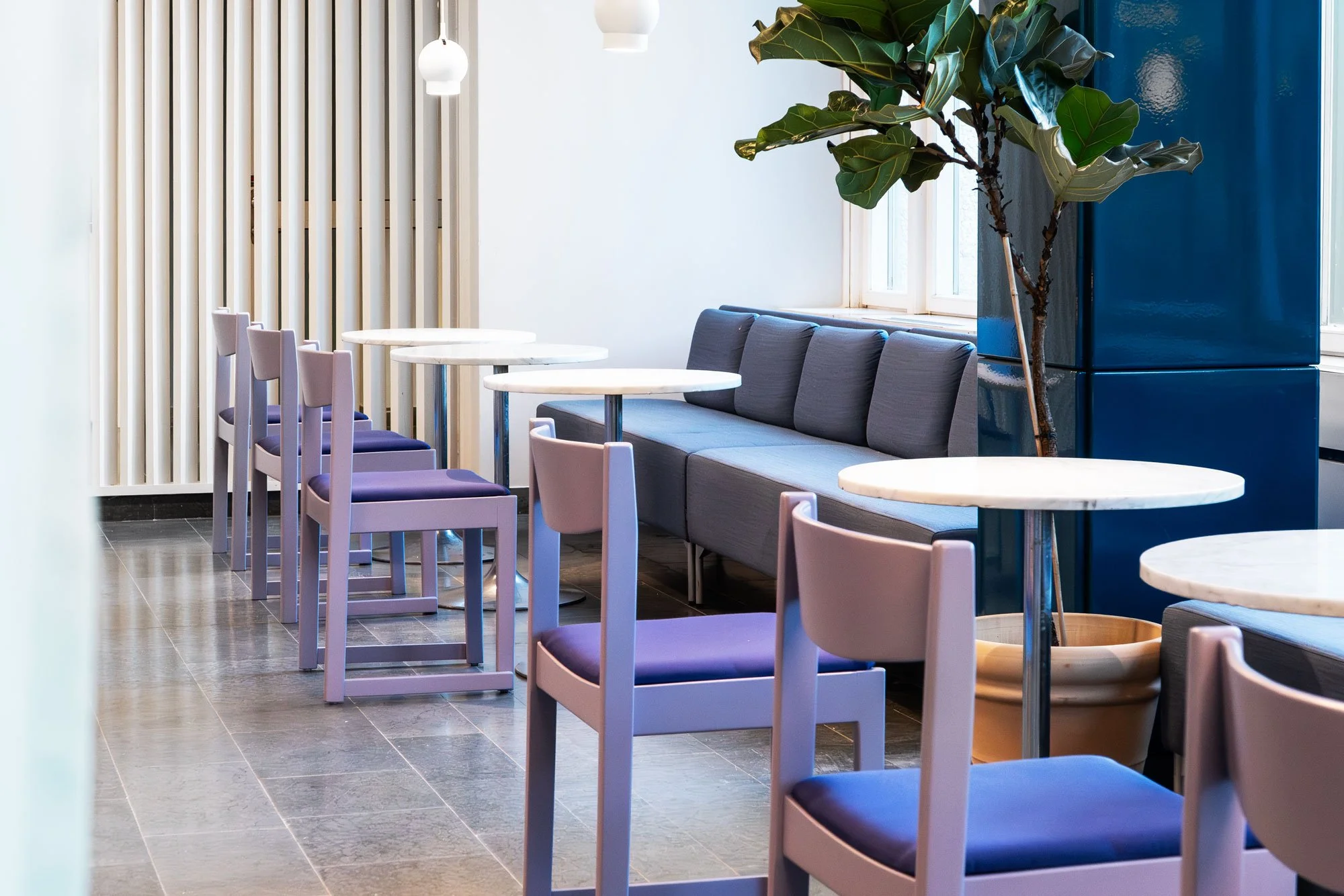 The starting point was what was already there: limestone floors, enamel-clad columns, and a striking wall mounted artwork at the entrance. Building on these elements, we curated an interior where nearly every piece — furniture, textiles, rugs, and lighting — is recycled and upholstered with repurposed textiles. Café tables and benches were restored, lacquered, and reupholstered to extend their lifespan.