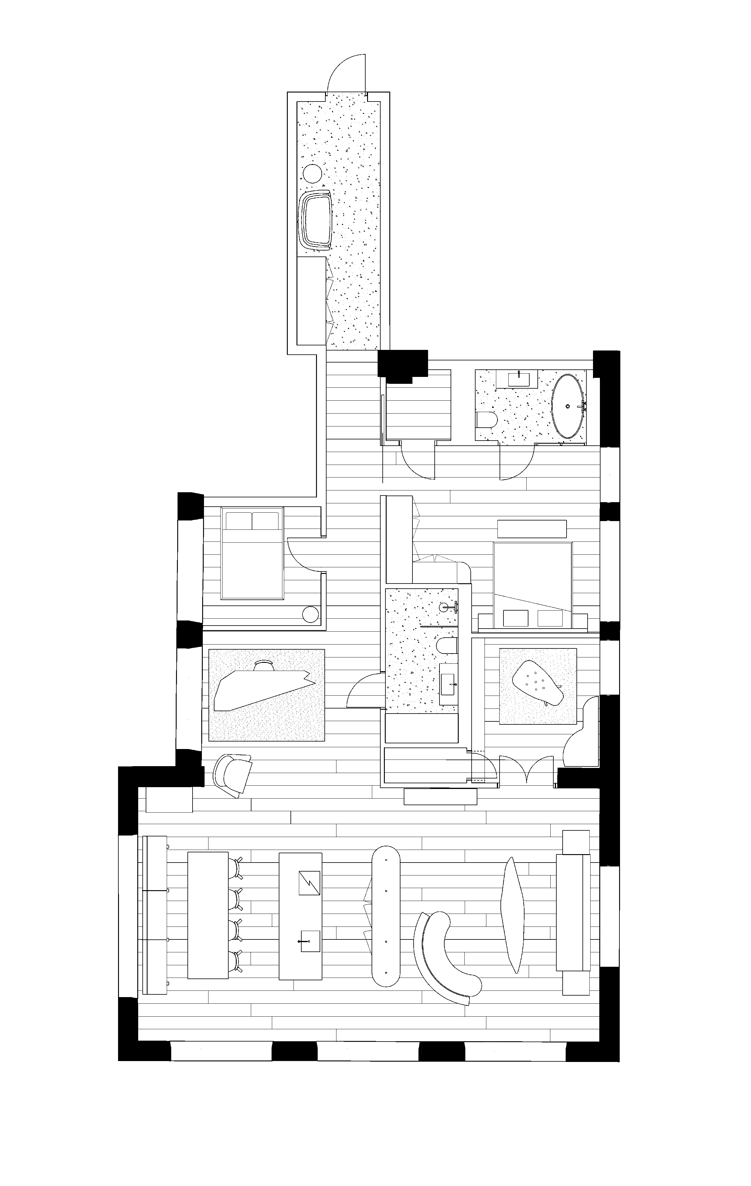 Full rebuild where the main objective was to open up and add social spaces for many guests while working with an expressive yet delicate color scheme that accentuates the client’s art collection. The new plan includes a large social space functioning as a kitchen, living room and workspace, one main bedroom, a guest room and a library.